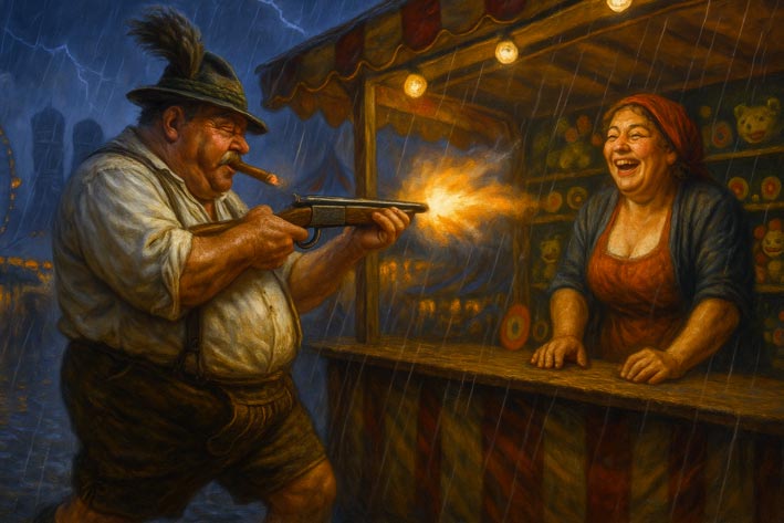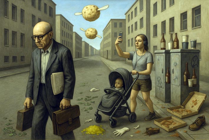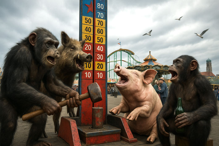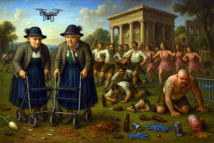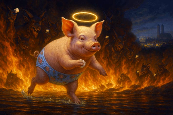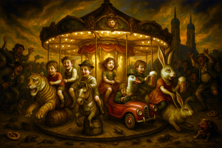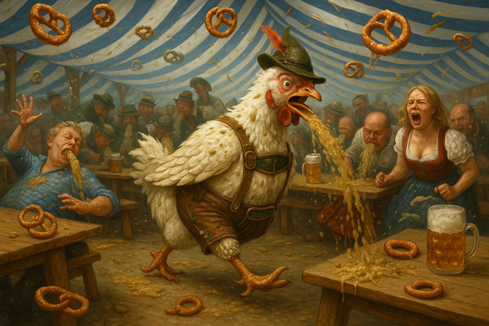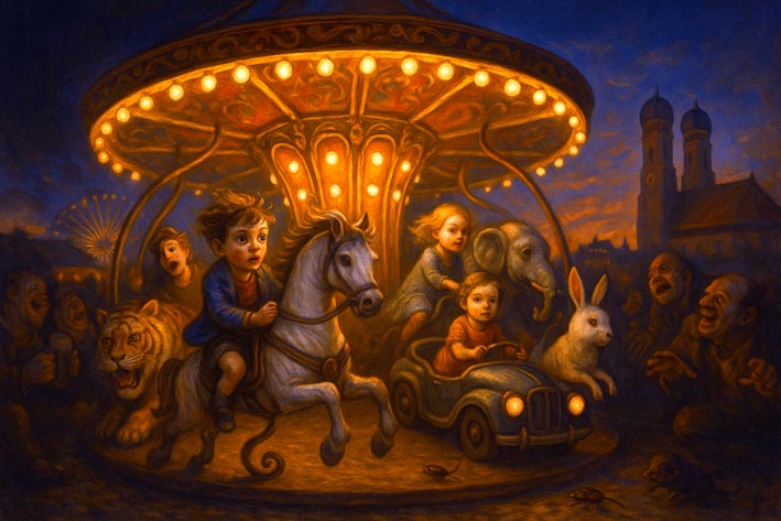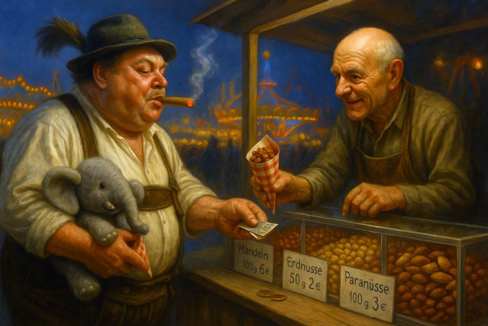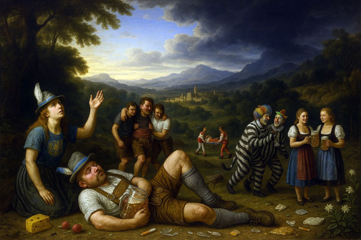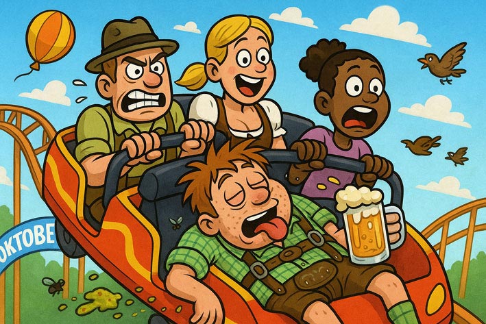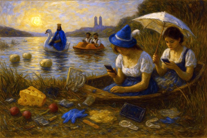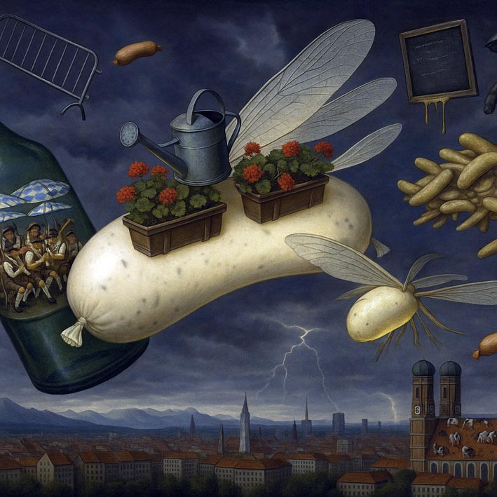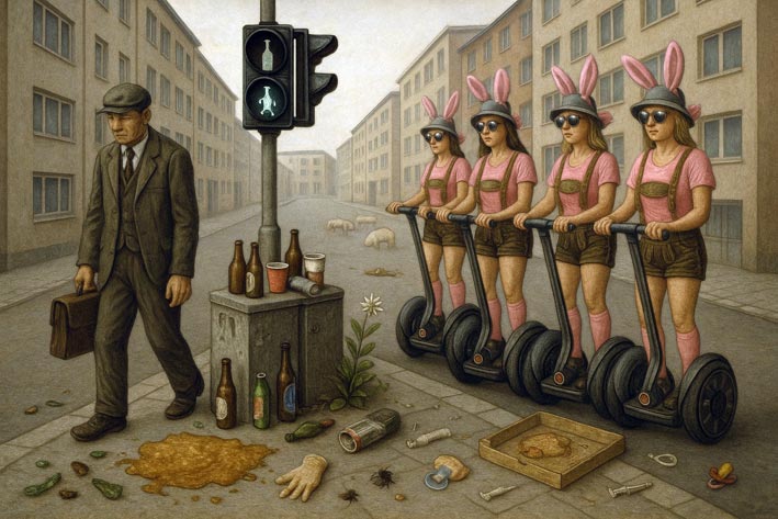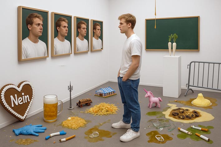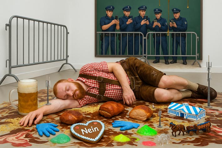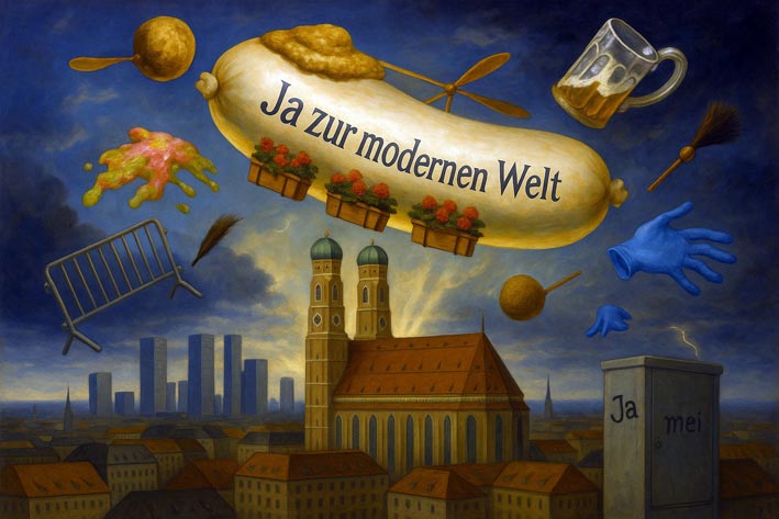 Woasd, wenn Wiesn is flackd bei mir in der Lindwurmstraß oiwei a Haufa Glump auf da Straß. Iwaroi Glosscherm. Iweroi a Gschpeiberts, Dreeg und Lettn. Im Bus am Sitz. Wosd hischausd hod scho eppa higschbiem. Habi gsagd, Dinringer, habi gsagd, lass die KI doch a Foto macha von der Lindwurmstraß zur Wiesnzeit. Howama dengd boarisch werd die KI eh ned vaschteh, und dann hobi gsagd: