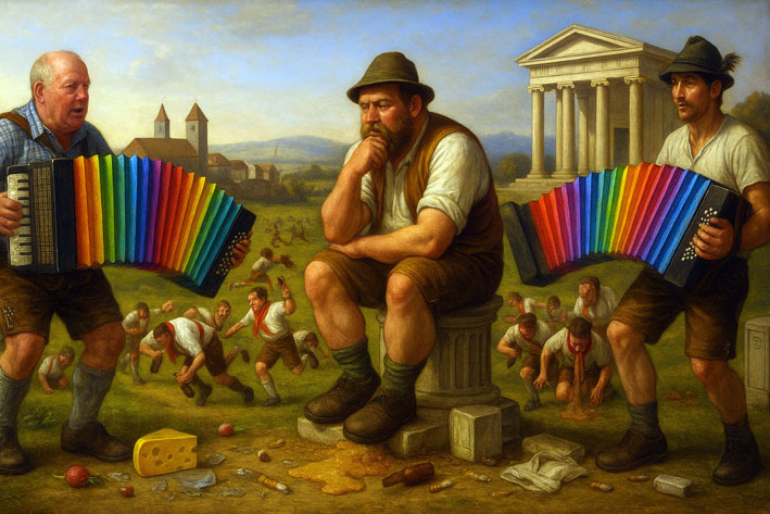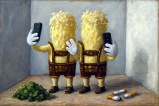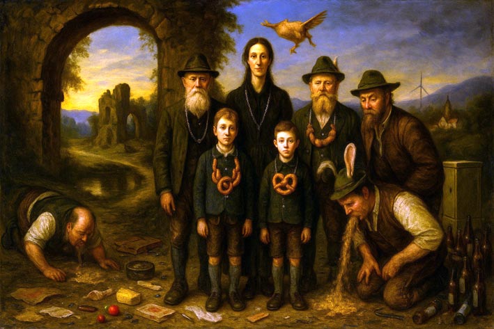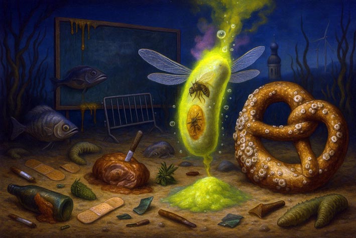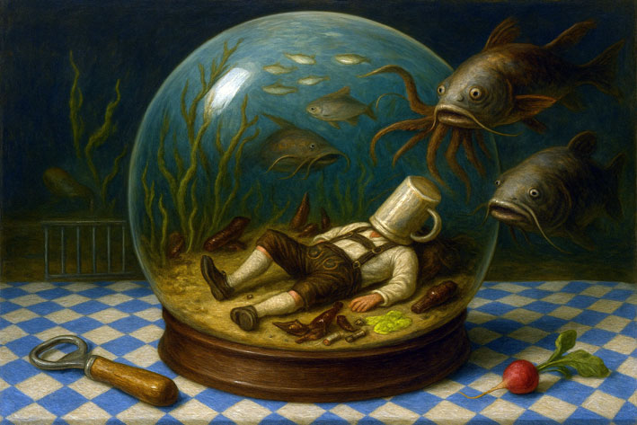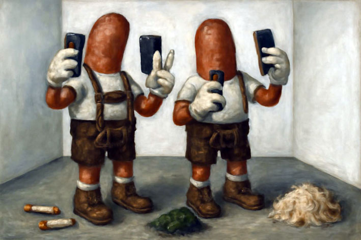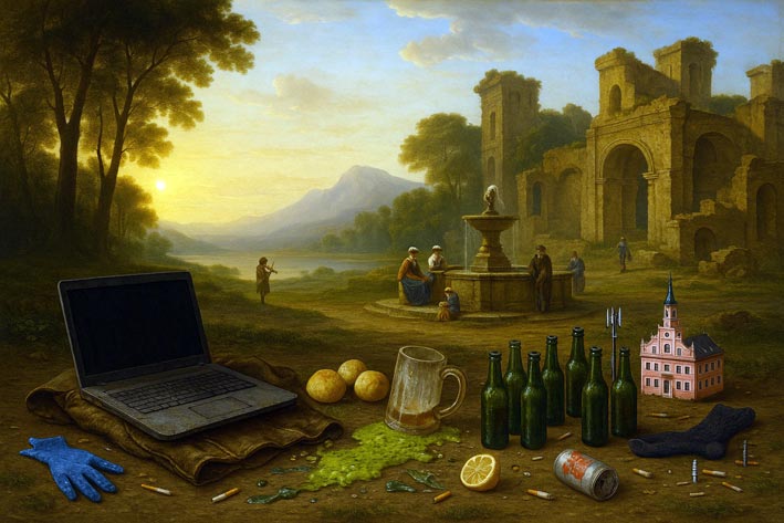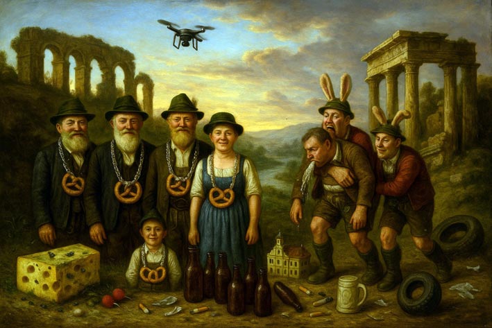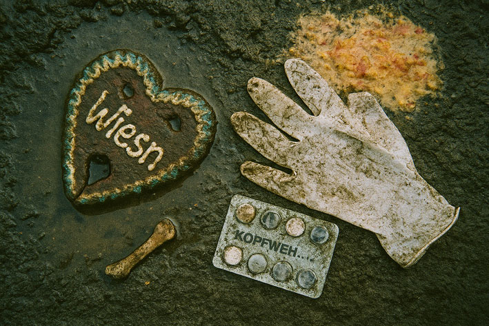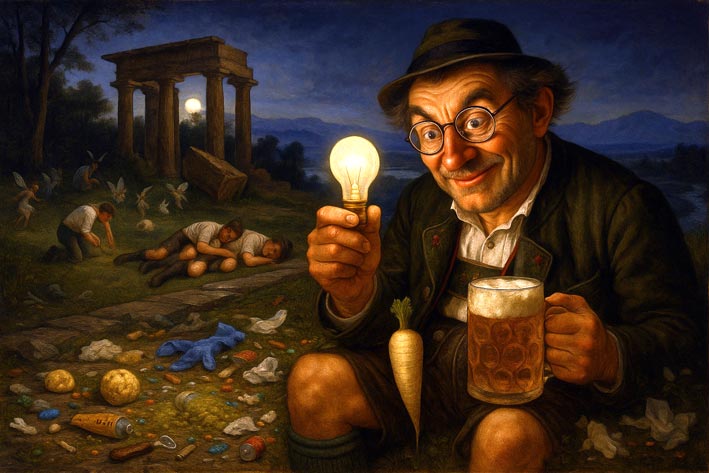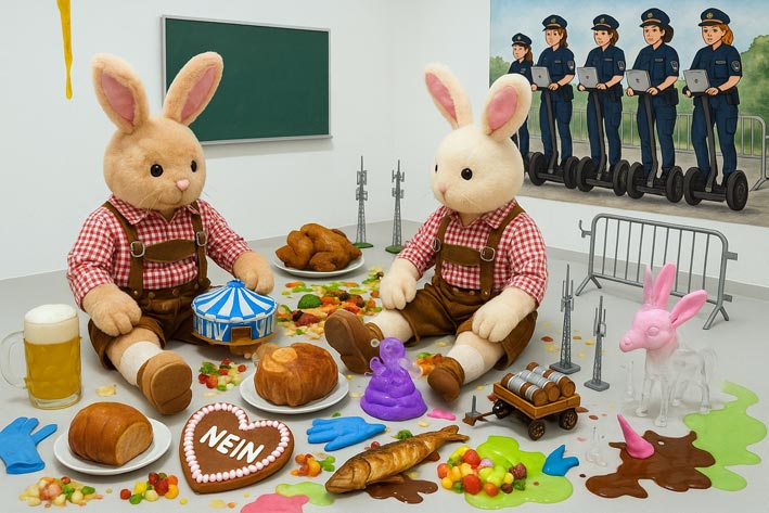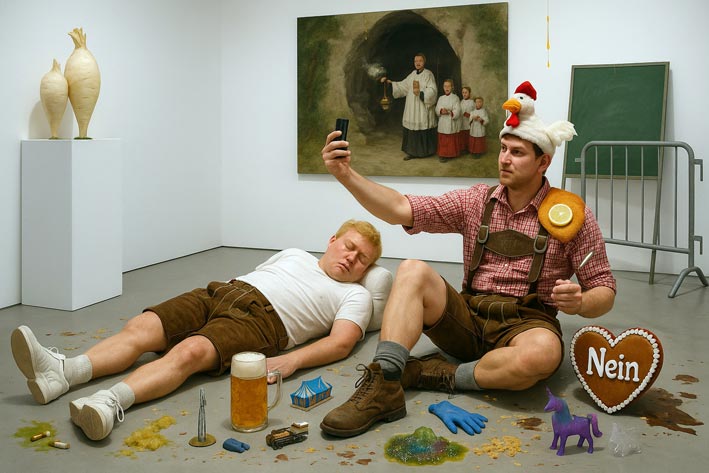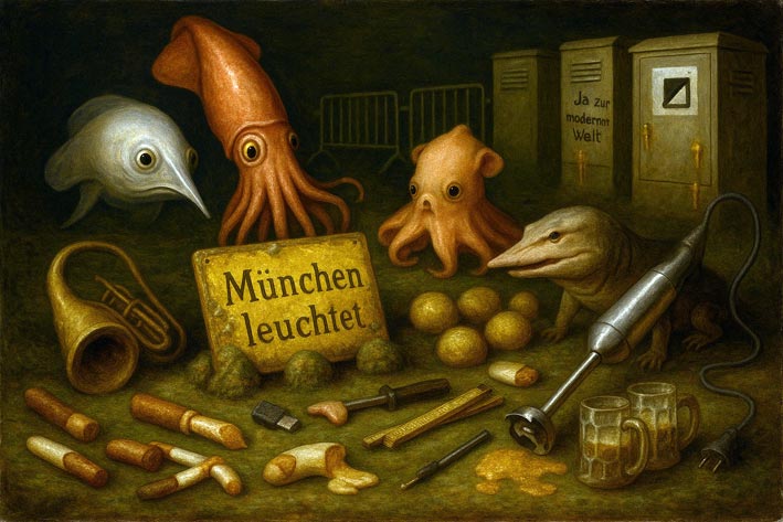 Am Trottoir flackan drei Larifari, oan hams oobissn, daneem bappt a Nosnramme. Weiße, greane und braune Glasscherm lieng aa umanand, zwoa Oachkatzlschwoafin, a Dingolfing, a Holz-vor-der-Hüttn im Miniaturformat als Anhänger von am Schlissl und a Zigarrettn, wo no a greana Lunganharing drobappt. Zwoa Wrdlbrmft und a oafchacherner Zwiefacher lieng aa dabei. Arschlings sihgt mer a oroschne Lackn Gschpeiberts. Und überoi flackan Zibebn und griebner Kren. Des, sog i, des duasd amal promptn und na lasst des vo der KI fotografiern!“