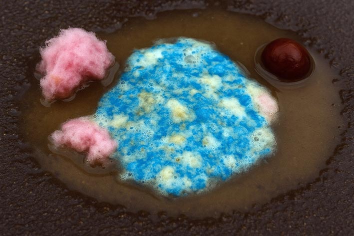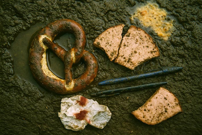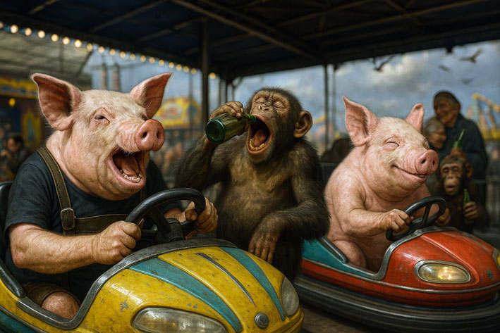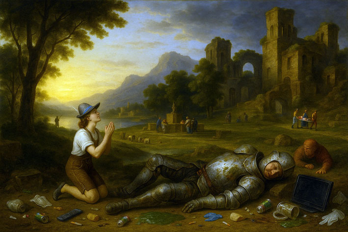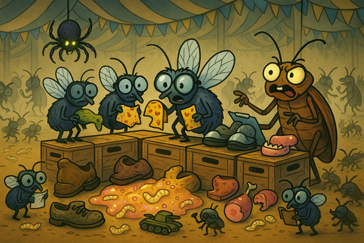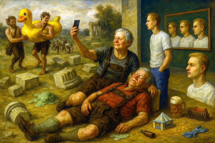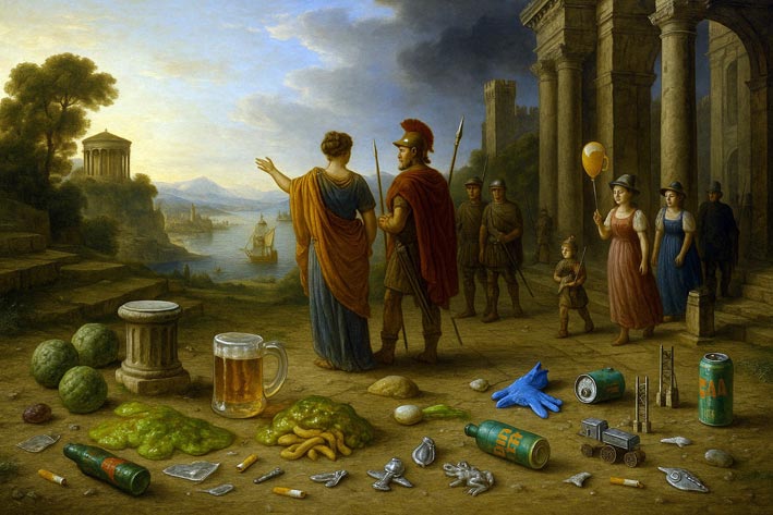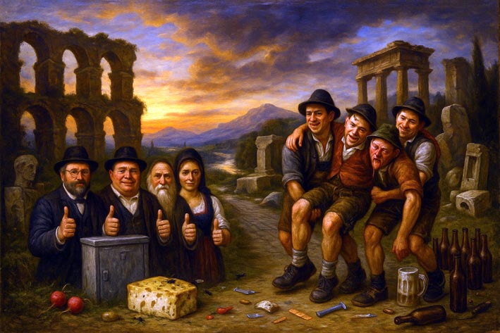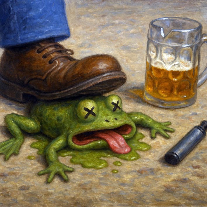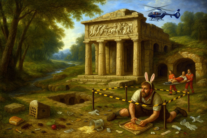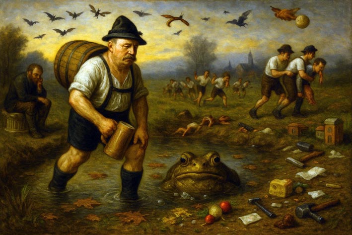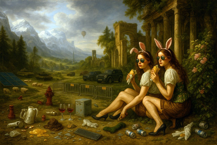Am Trottoir flackan drei Larifari, oan hams oobissn, daneem bappt a Nosnramme. Weiße, greane und braune Glasscherm lieng aa umanand, zwoa Oachkatzlschwoafin, a Dingolfing, a Holz-vor-der-Hüttn im Miniaturformat als Anhänger von am Schlissl und a Zigarrettn, wo no a greana Lunganharing drobappt. Zwoa Wrdlbrmft und a oafchacherner Zwiefacher lieng aa dabei. Arschlings sihgt mer a oroschne Lackn Gschpeiberts. Und überoi flackan Zibebn und griebner Kren. Des, sog i, des duasd amal promptn und na lasst des vo der KI fotografiern!“