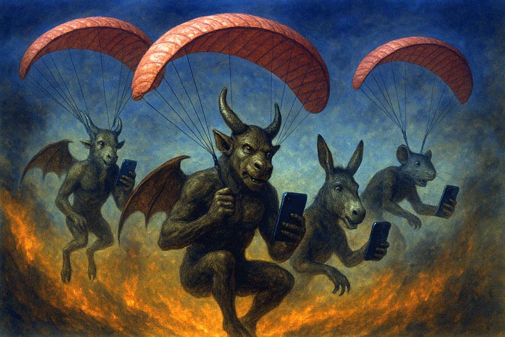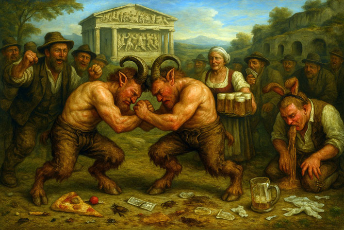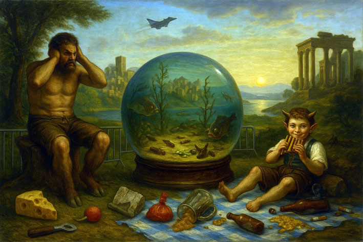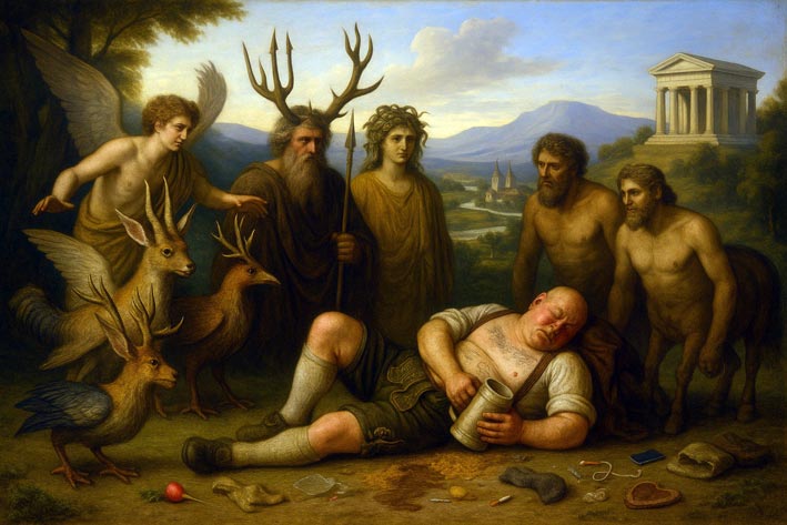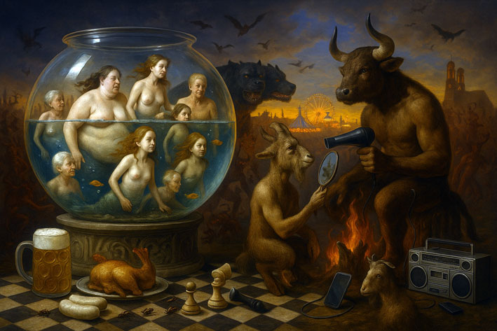 Minotaurus föhnt sich in den Spiegel guckenden Satyrn die Haare, beobachtet von Sirenen und druntergemischten unrasierten. |