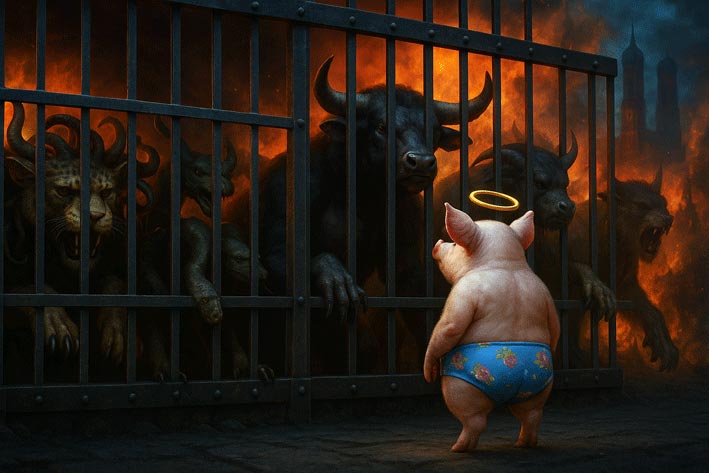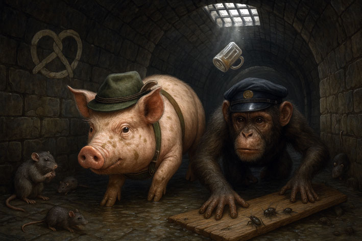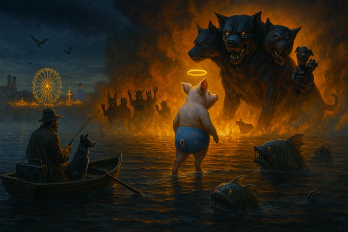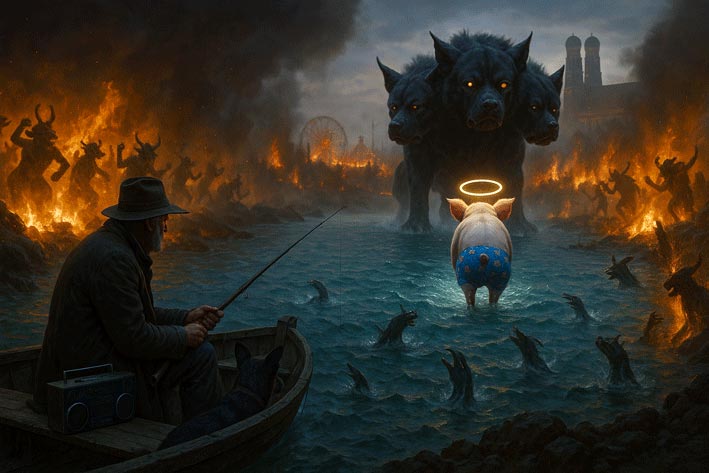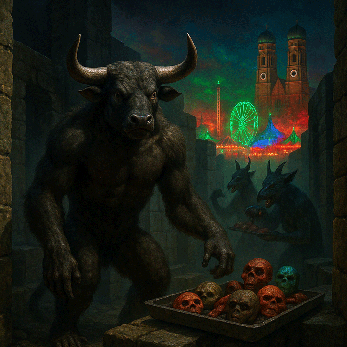 Cerberus hatte seine Position verändert. Nicht der gesamte Körper – nur die vorderen Pranken. Er hatte sich aufgerichtet. Der mittlere Kopf blickte in Richtung des Maßkrugs. Kein Laut, kein Bellen, kein Knurren. Der Blick leer. Oder wachsam. Nicht eindeutig.