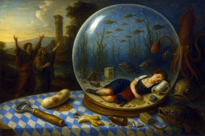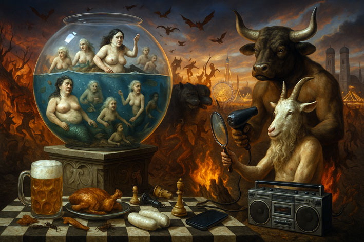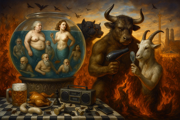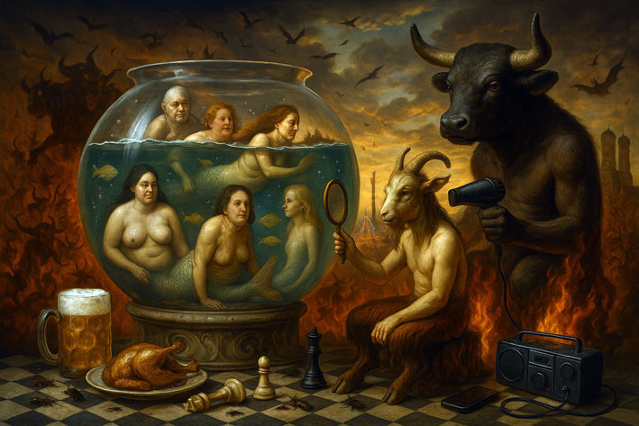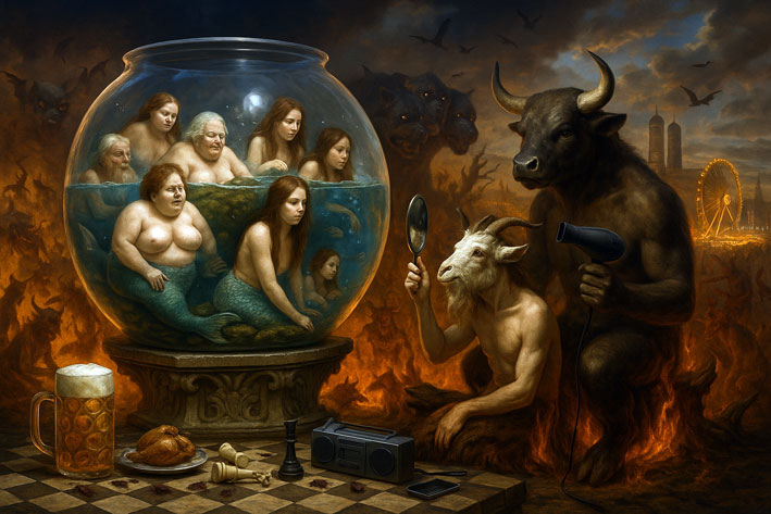 Minotaurus föhnt dem Satyrn die Haare, beobachtet im Tischaquarium von Sirenen und vergessenen, unrasierten.