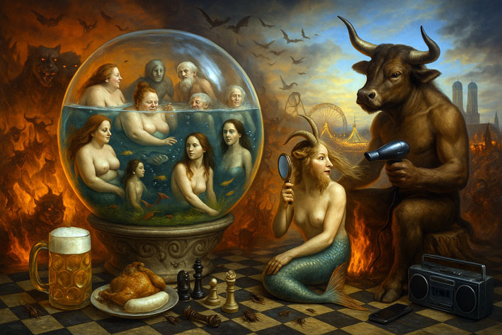Minotaurus föhnt sich in den Spiegel guckenden Satyrn die Haare, beobachtet von Sirenen im Tischaquarium nach Blilpzulp