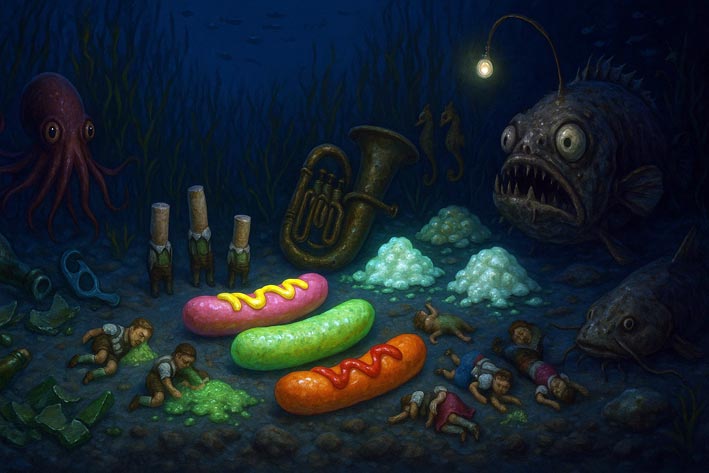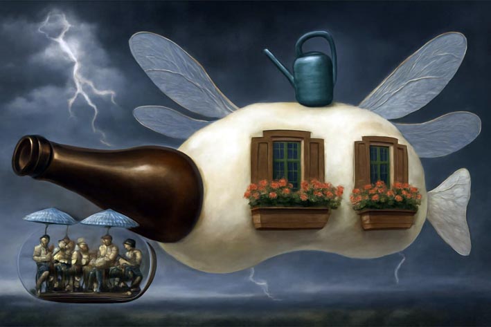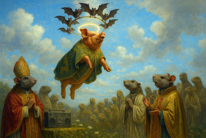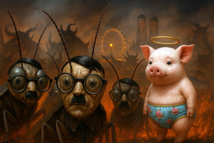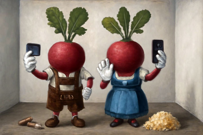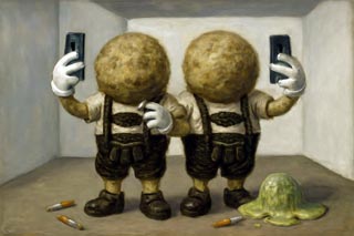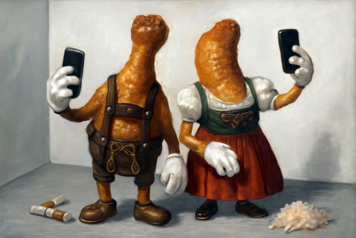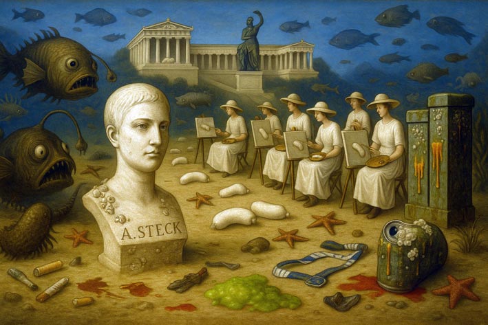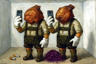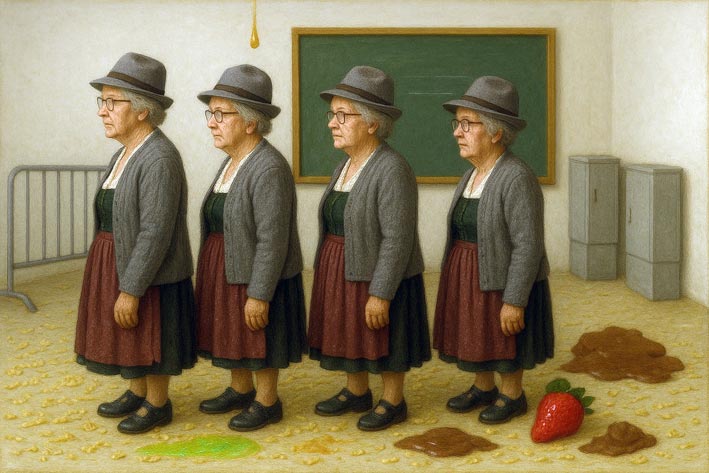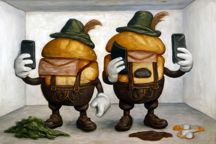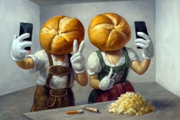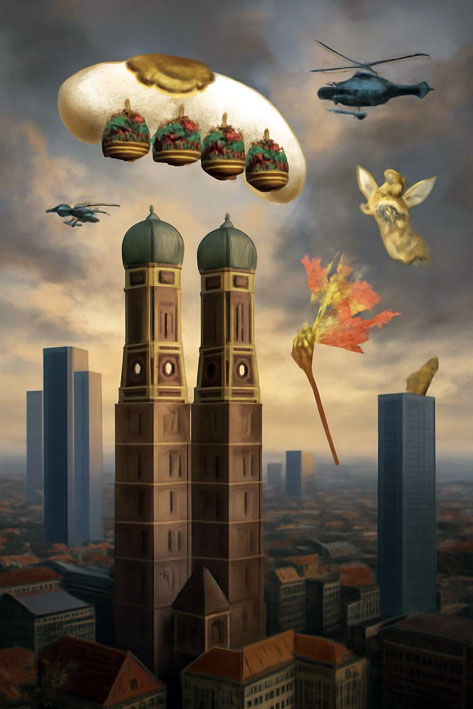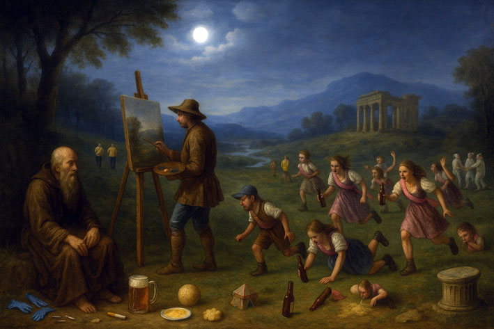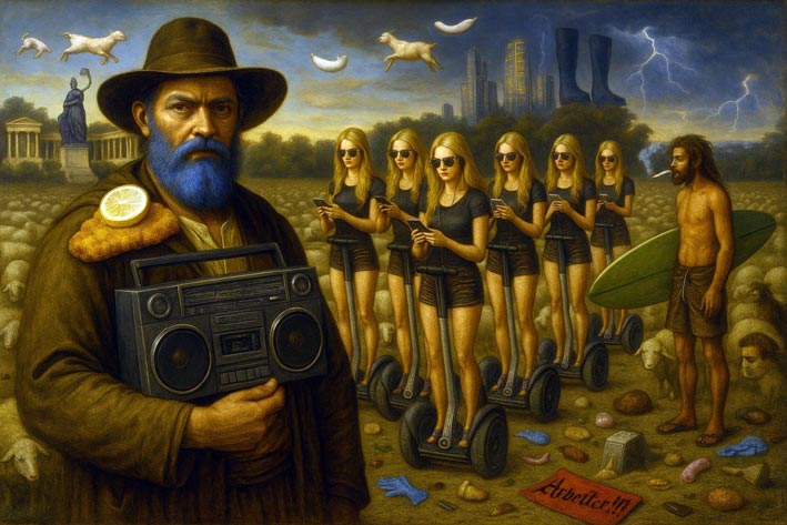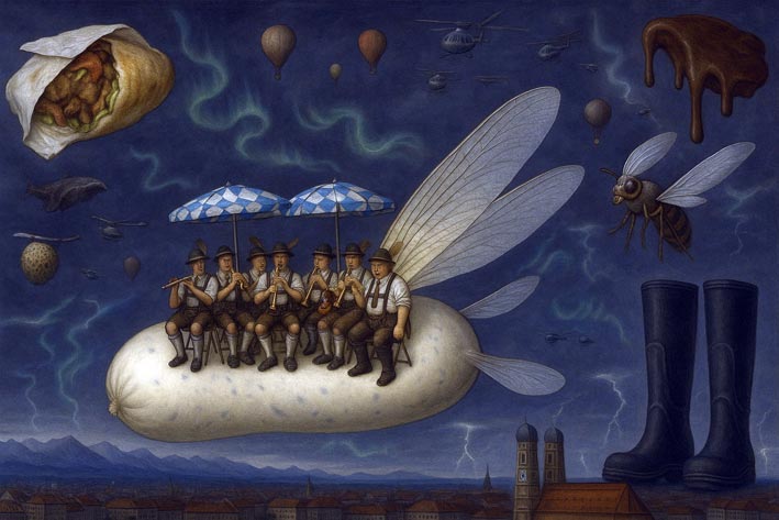 Mache ein querformatiges Ölgemälde folgenden Inhalts: da öffnen sich die Wolken und mit blinzelnden Augen treten achtzehn Packträger hervor und verkünden das Ende der Welt.Links und rechts stehen je vier goldene Jungfrauen mit Semmelbrösel bepappt und halten ein vernickeltes Butterbrot in der Hand. Die Luft zitterte wie Schweinesulz, die Erde wühlte sich auf, die Vesuve speiten Honig und Sauerkraut, Nacht- und Tageulen, Glühwürmchen und Lämmergeier schwirrten gespensterhaft auf dem Fußboden umher, panikartig zerplatzte ein alter Leberkäse.
