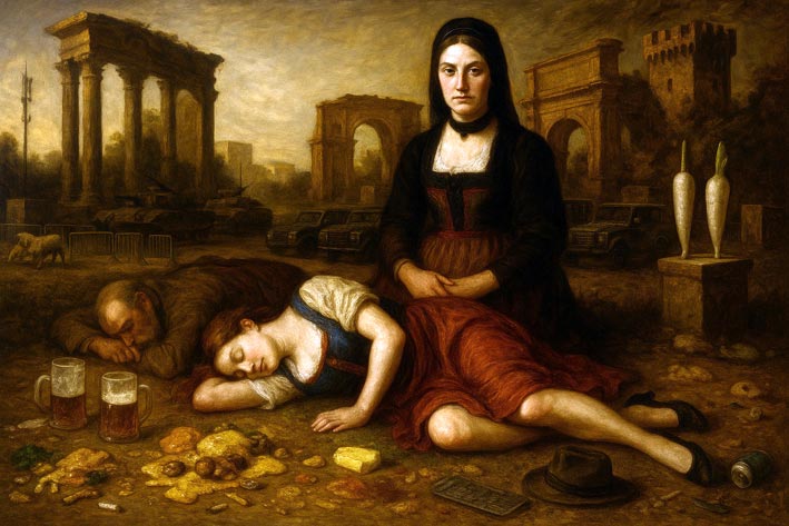 »Man wird dich auch sättigen mit Schande für Ehre. So saufe du nun auch, daß du taumelst; denn dich wird umgeben der Kelch in der Rechten des HERRN, und mußt schändlich speien für deine Herrlichkeit.«