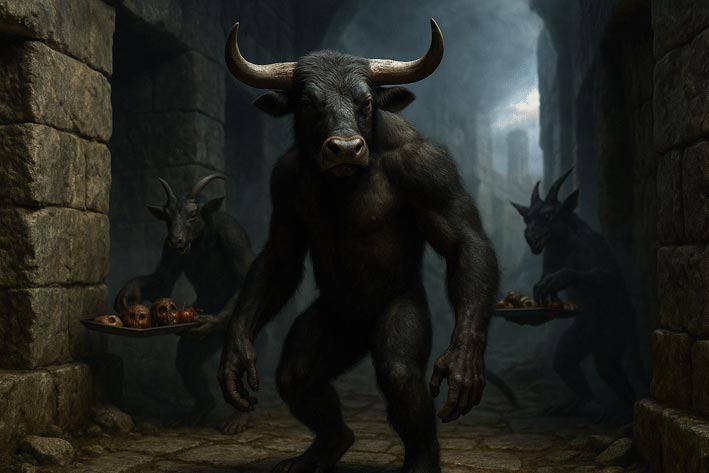 Minotaurus föhnt sich in den Spiegel guckenden Satyrn die Haare, während das Handy klingelt