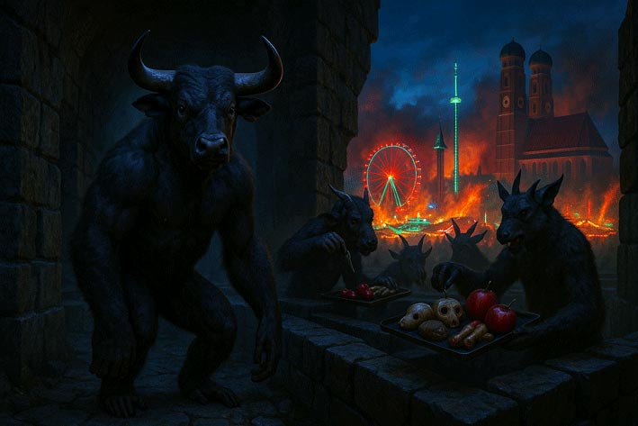 Flammen am Baumstumpf, auf dem der Minotaurus saß, brannten gleichmäßig weiter. Die Farbe der Glut: orange, an den Rändern ins Violett übergehend. Die Asche sammelte sich unter den Paarhufen des Satyrs. Ein Teil davon wurde vom Föhnen verwirbelt.