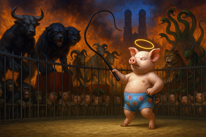 Cerberus hatte seine Position verändert. Nicht der gesamte Körper – nur die vorderen Pranken. Er hatte sich aufgerichtet. Der mittlere Kopf blickte in Richtung des Maßkrugs. Kein Laut, kein Bellen, kein Knurren. Der Blick leer. Oder wachsam. Nicht eindeutig.