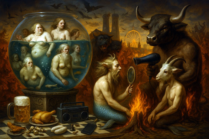 Minotaurus föhnt sich in den Spiegel guckenden Satyrn die Haare, beobachtet von Sirenen im Tischaquarium nach Blilpzulp